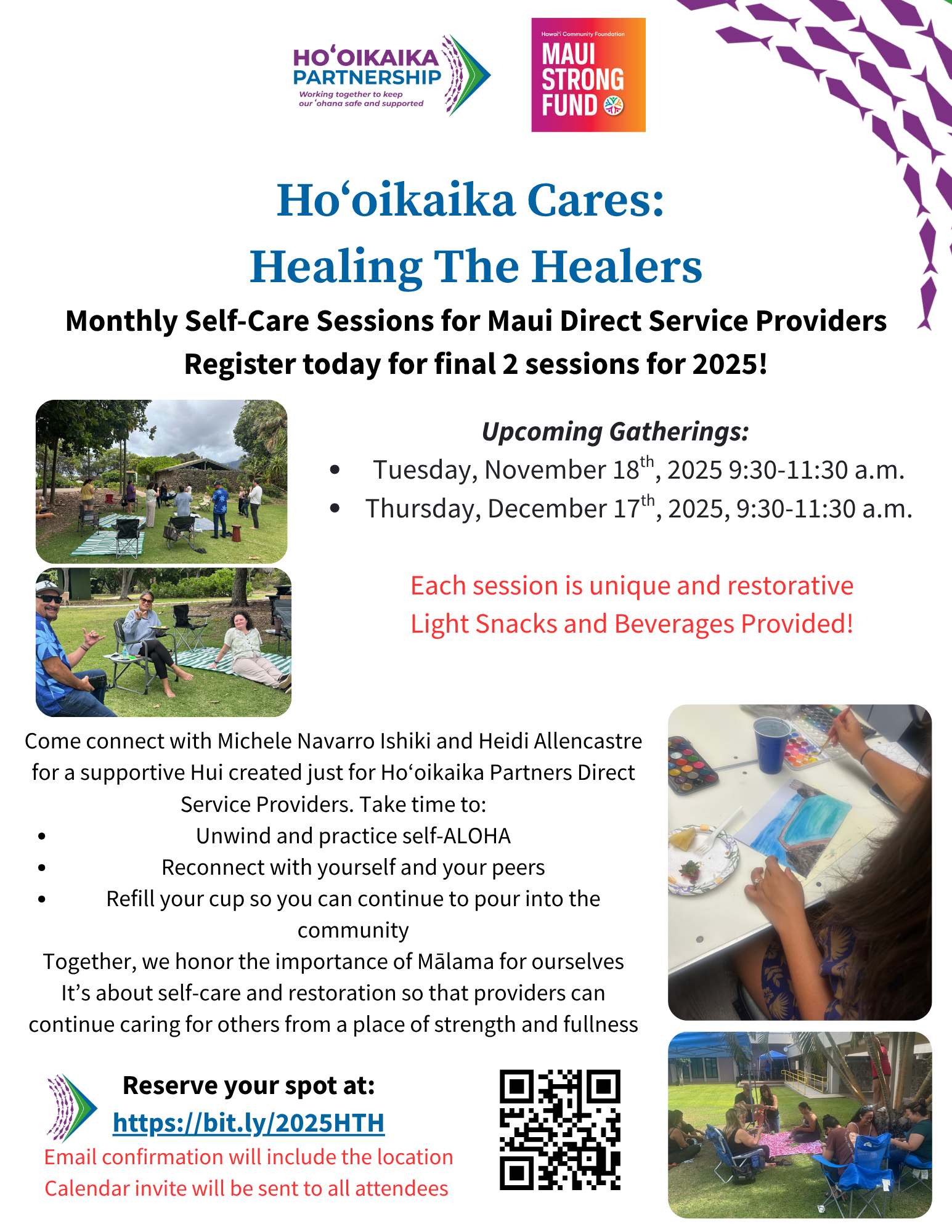 Thanks to the generous support of the Maui Strong Fund, administered by the Hawaiʻi Community Foundation, Hoʻoikaika Partnership provides Healing the Healers in partnership with MNI Counseling. Join Michele Navarro Ishiki and Heidi Allencastre for these self-care sessions that prioritize connection and peer support.