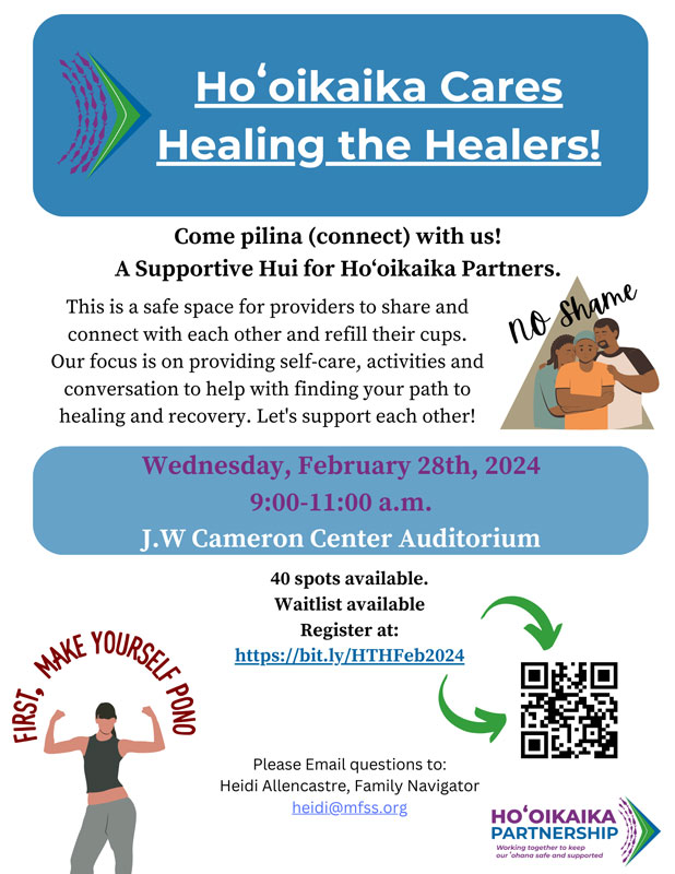 Healing the Healers is a supportive wellness hui and safe space for providers to share and connect and refill their cups so that they can continue to pour themselves into the families of Maui. Please share this flier and registration in the different spaces and initiatives that you are in and with your staff.