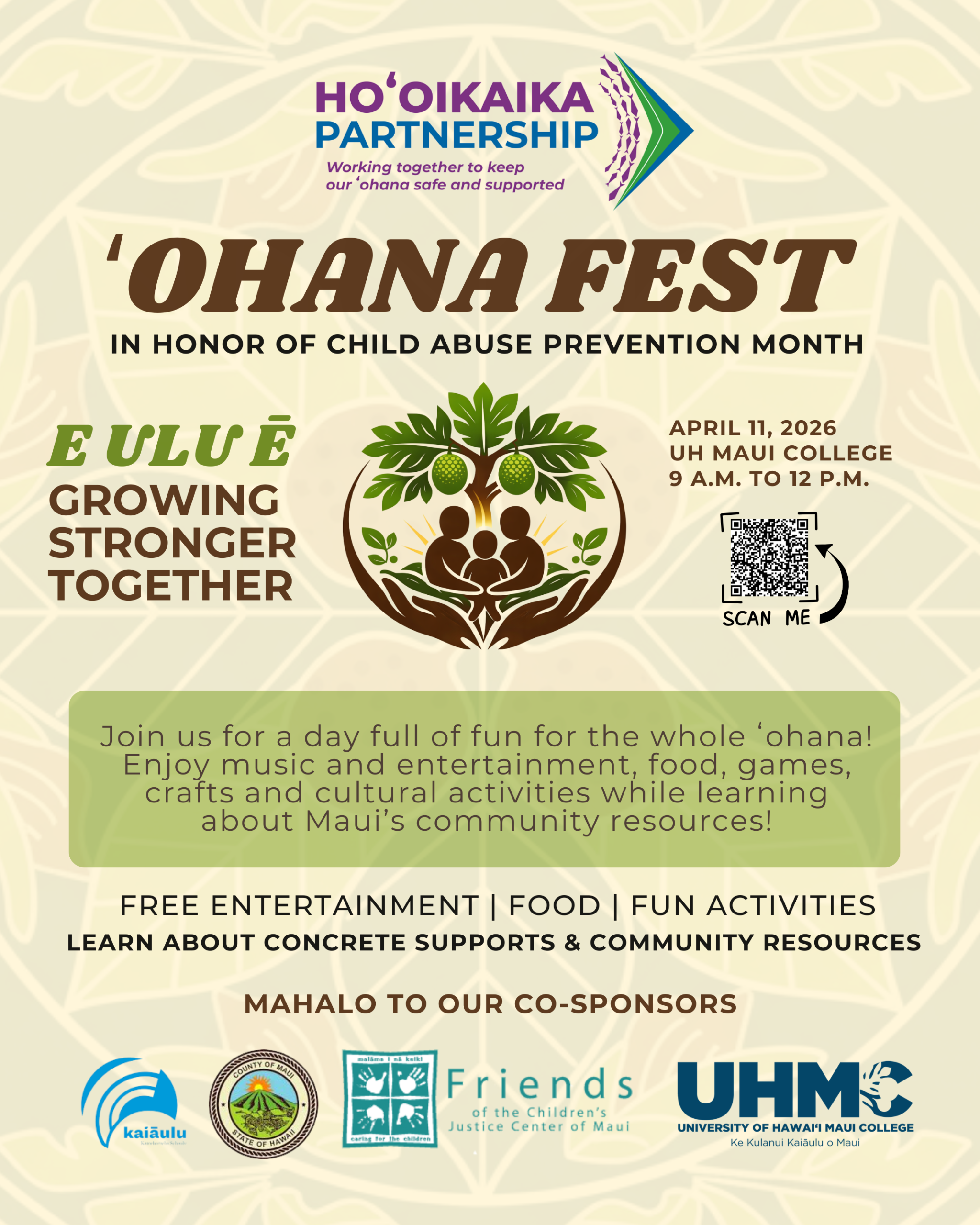 April is Child Abuse Prevention Month, a time when communities come together to strengthen families and ensure all keiki are healthy, safe, and supported. In Maui County, the theme E Ulu Ē: Growing Stronger Together is inspired by the ulu tree.