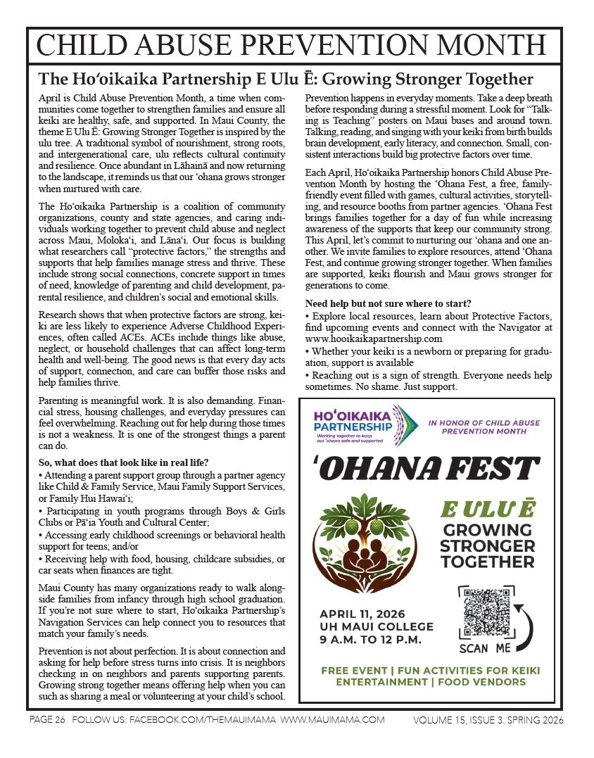 This April, let’s commit to nurturing our ʻohana and one another. We invite families to explore resources, attend ʻOhana Fest, and continue growing stronger together. When families are supported, keiki flourish and Maui grows stronger for generations to come.