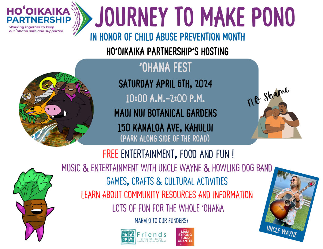 In honor of Child Abuse Prevention Month, Hoʻoikaika Partnership is hosting the annual ʻOhana Fest – Journey to Make Pono on Saturday, April 6, 2024 at the Maui Nui Botanical Gardens. Please park along the side of the road.